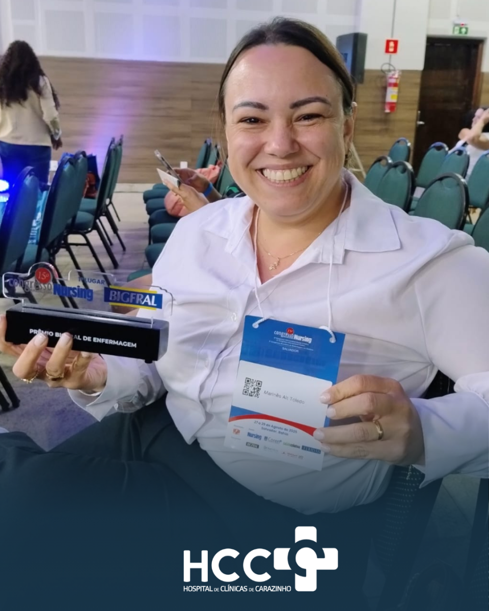 A excelência e dedicação dos profissionais do Hospital de Clínicas de Carazinho (HCC) mais uma vez ganharam destaque nacional. A técnica de enfermagem Marinês Aparecida Alt Toledo, que atua no Centro Cirúrgico do HCC desde 2022, foi premiada em primeiro lugar durante o 15º Congresso Nursing, realizado entre os dias 27 e 29 de agosto de 2025, em Salvador (BA).