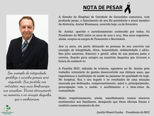 A direção do Hospital de Caridade de Carazinho comunica, com profundo pesar, o falecimento de seu Ex-presidente e atual membro da diretoria, Azelar Kissmann, ocorrido hoje, 02 de fevereiro.