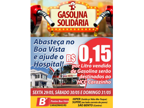 A campanha é válida para os três postos Boa Vista de Carazinho, localizados junto ao Hiper Boa Vista, na saída para Não-Me-Toque; na esquina da Avenida São Bento; e ao lado do Correio do Povo.