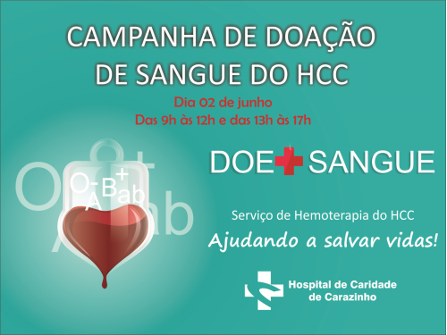 O Hospital de Caridade de Carazinho, em parceria com o Hemocentro de Passo Fundo – Hemopasso, estará promovendo, neste sábado, 02 de junho, a primeira edição da Campanha de Doação de Sangue de 2018. A ação acontecerá em frente ao HCC, das 9h às 12h e das 13h às 17h.