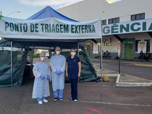 Com o apoio do 38 Batalhão da Brigada Militar e do SEST SENAT de Carazinho, foi montada uma tenda em frente ao Serviço de Emergência do HCC, que está sendo utilizada como um ponto externo de triagem.