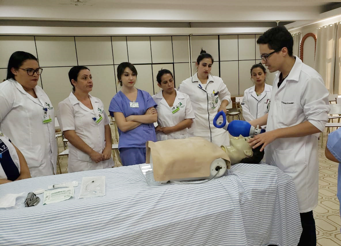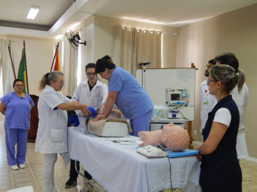 As equipes de enfermagem que atuam na Unidade de Internação Clínica destinada aos pacientes do Sistema Único de Saúde – Posto 4, do Hospital de Caridade de Carazinho, participaram, na quarta-feira (21), de uma capacitação sobre Ressuscitação Cardiopulmonar, ministrada pelo médico clínico geral, Dr. Frederico Alt, pelo médico residente, Dr. Gunnar Kussler, pela enfermeira do setor, Grasiela Negri, além das acadêmicas do Curso de Enfermagem da Universidade Luterana do Brasil – ULBRA, campus Carazinho, Mariana Vargas, Mariane Braga e Zemilda Correa.