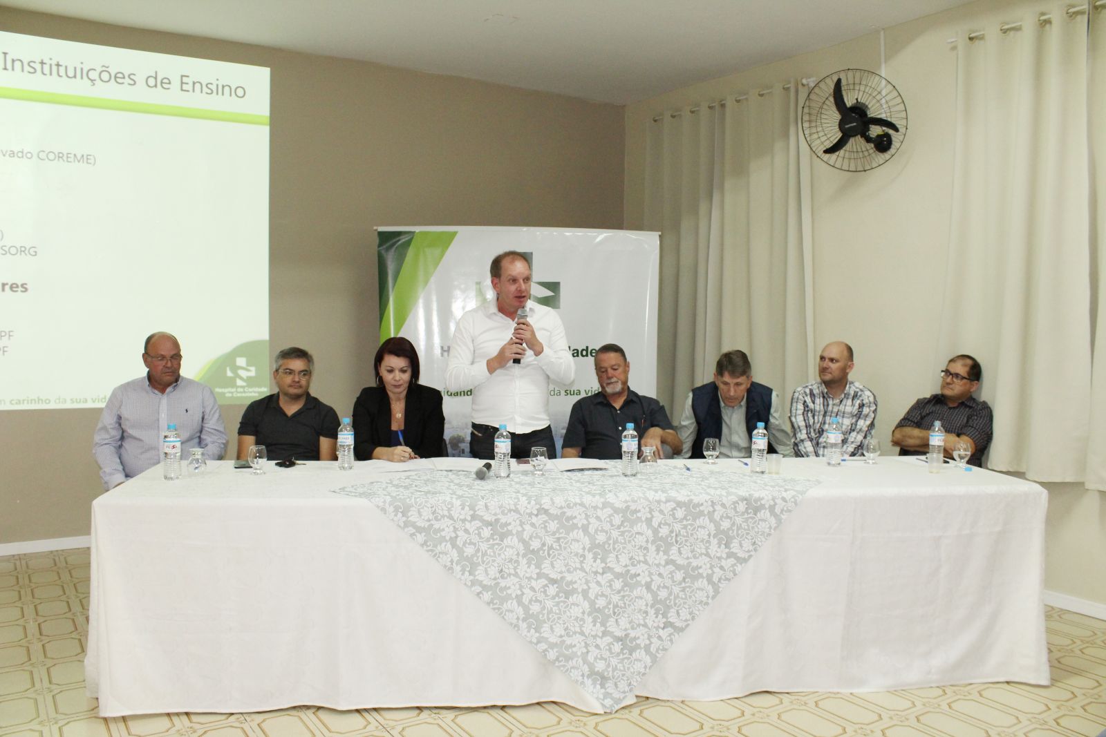 Na mesa de honra estavam, ainda, o vice-presidente do hospital, Luis Fernando Muneroli, o diretor financeiro, Tito Graeff Arnold, o diretor técnico, Darlan Lara, o assessor jurídico, Tiago Piva Hartmann, o presidente do Conselho Consultivo, Júlio Eduardo Piva, e a associada médica do Corpo Clínico, Cheila Mayorca de Faria de Freitas, que secretariou a reunião.
