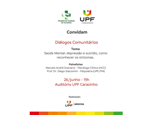 Com o tema “Saúde Mental: depressão e suicídio, como reconhecer os sintomas”, esse primeiro painel será conduzido pelo psicólogo clínico do HCC, Marcelo Graciano, e pelo médico psiquiatra e docente da UPF, Prof. Dr. Diego Giacomini.