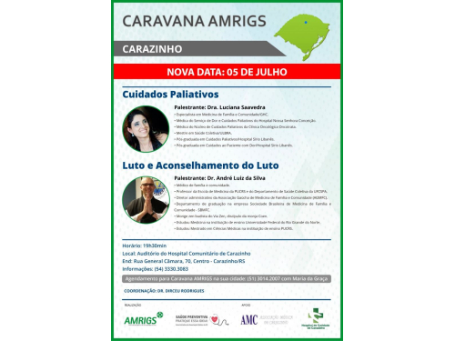 A Associação Médica de Carazinho, em parceria com o Hospital de Caridade de Carazinho e a Associação Médica do Rio Grande do Sul, estará promovendo, na próxima sexta-feira (05), uma palestra sobre Cuidados Paliativos, Luto e Aconselhamento do Luto.