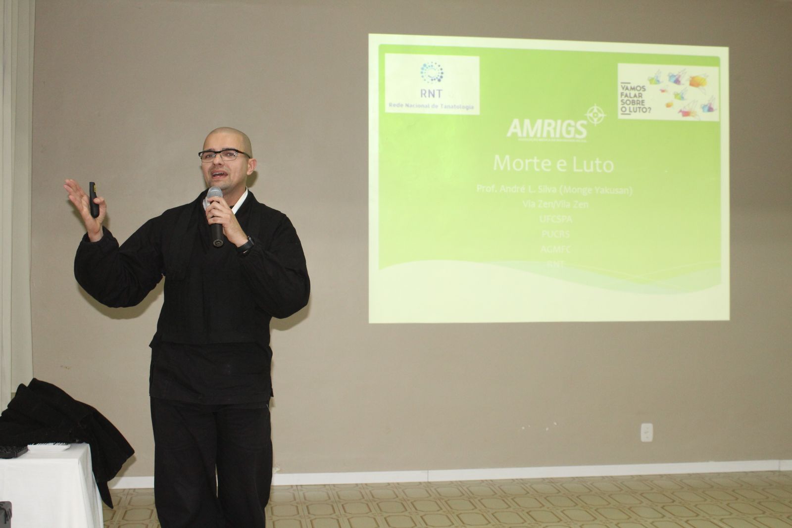 O médico de Família e Comunidade e monge zen budista, Dr. André Luiz da Silva, por sua vez, iniciou sua explanação sobre o Luto questionando os presentes sobre o que fariam se lhes restassem apenas um dia de vida. Além disso, detalhou as fases da terminalidade da vida diferenciando-as das fases do luto fisiológico, e relatando, ainda, as variáveis psicossociais que impactam no processo do luto, que estão relacionadas ao contexto de quem vivencia tal situação.