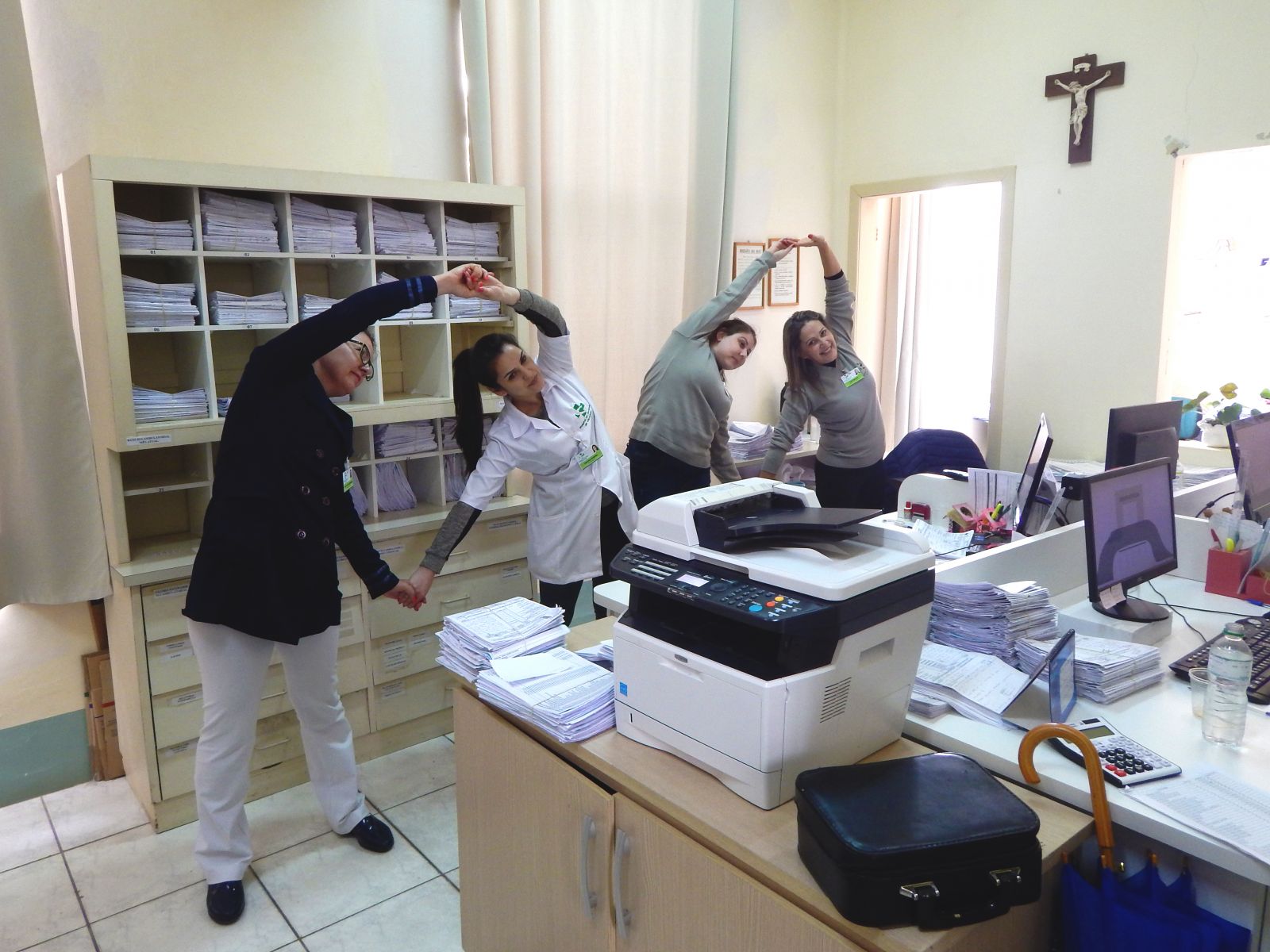 Com o objetivo de prevenir lesões e outras doenças ocasionadas pela atividade ocupacional, o Hospital de Caridade de Carazinho proporciona ao seus funcionários, quinzenalmente, momentos de ginástica laboral. As atividades são realizadas pelo Serviço Especializado em Engenharia de Segurança e em Medicina do Trabalho - SESMT, em parceria com a fisioterapeuta da instituição de saúde, Naiara Pereira.