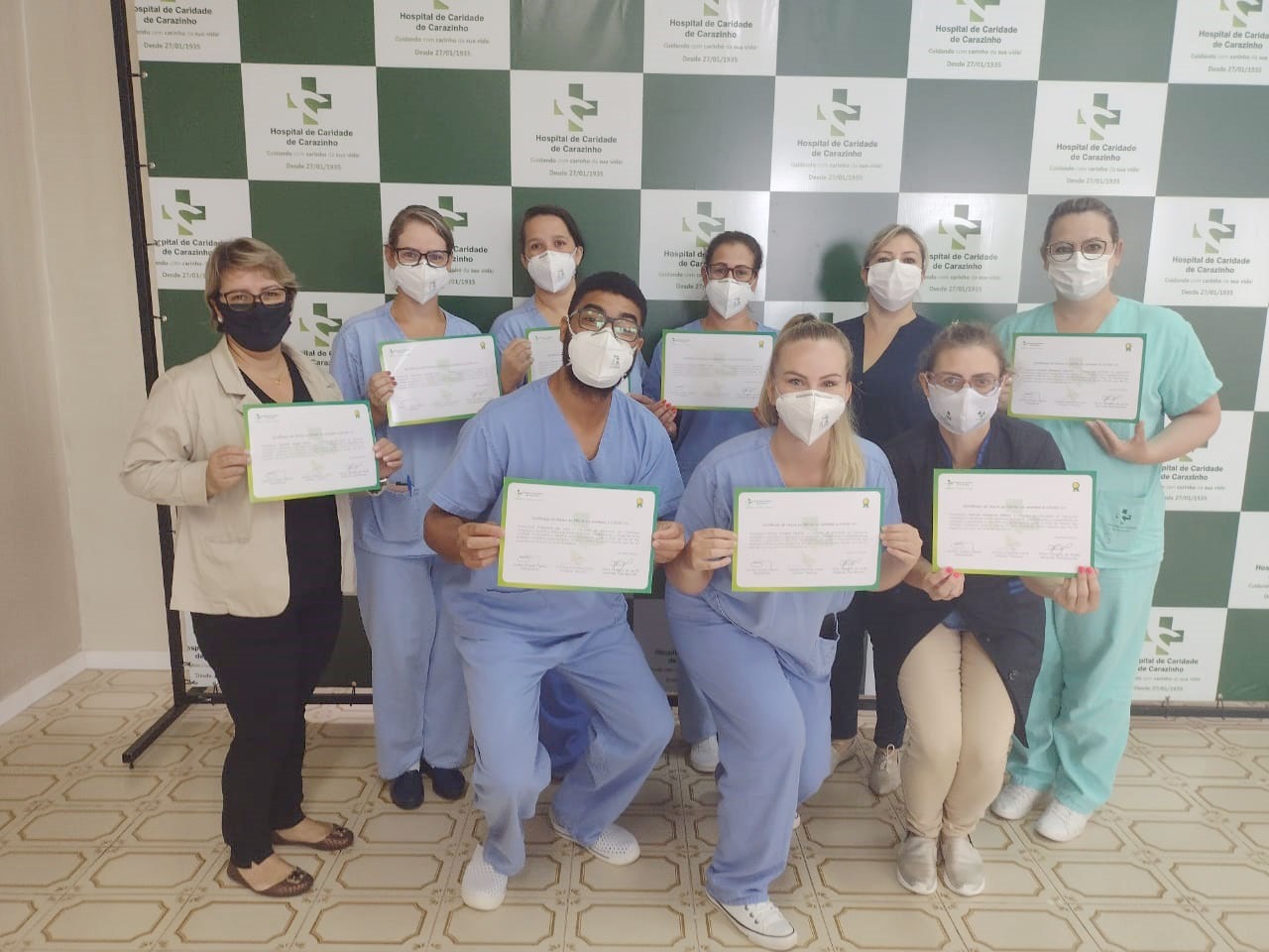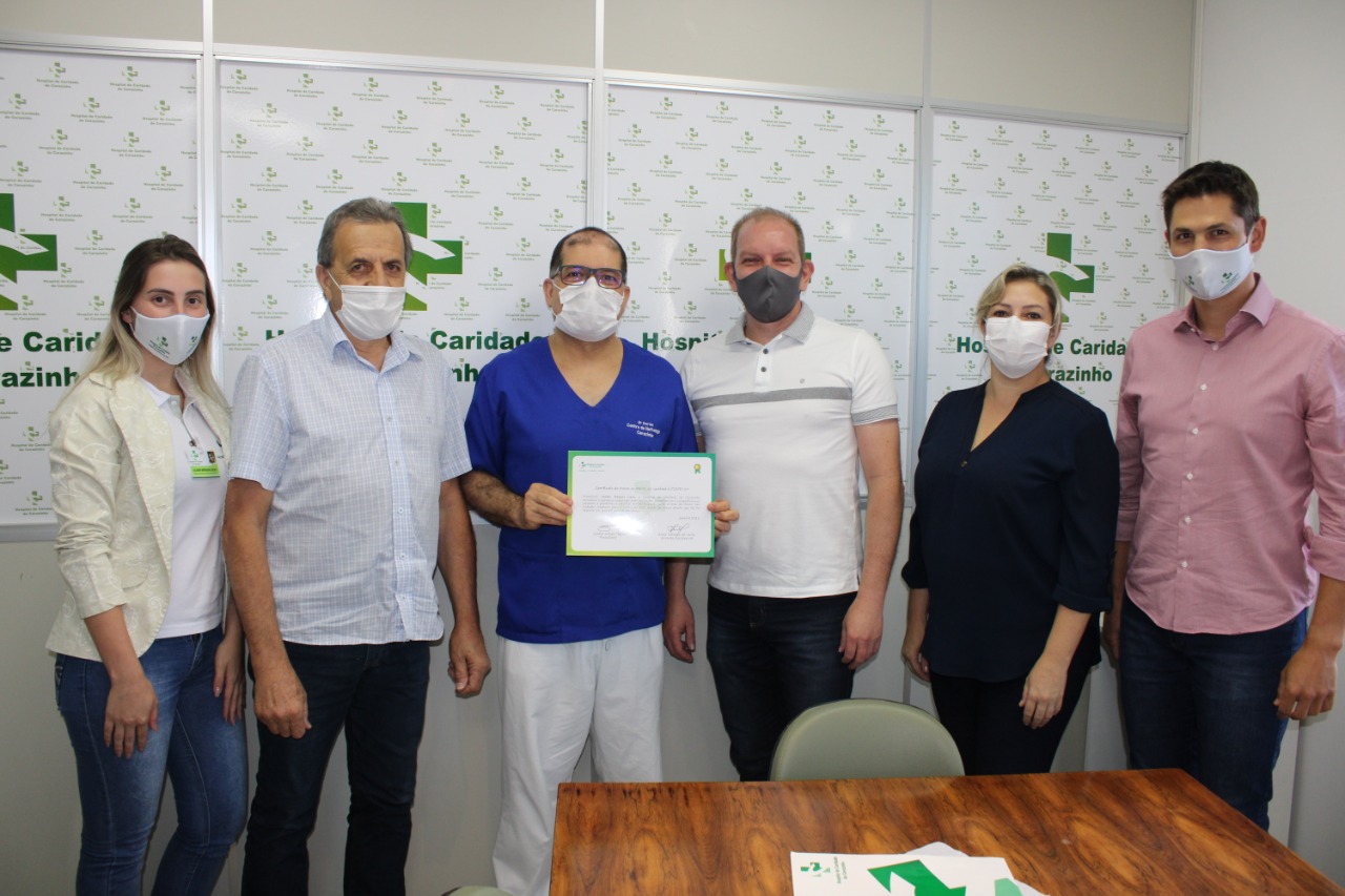O primeiro certificado foi entregue ainda na segunda-feira (18) para o médico da linha de frente do Hospital de Caridade de Carazinho Dr. Darlan Martins Lara, o qual também é Diretor Técnico do HCC, médico intensivista da Unidade de Terapia Intensiva (UTI) e na UTI da Covid-19. Dedica-se ao HCC desde novembro de 1993 e à UTI desde novembro de 1994. Fizeram a entrega do certificado, o presidente do HCC Jocélio Cunha, bem como o administrador Felipe Sohne, o diretor geral Hélio Lütz, a gerente de enfermagem Aline Vanessa de Avila e a assessora administrativa Liliane Morgan.