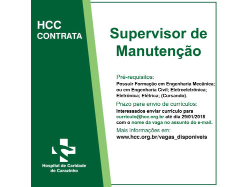 Interessados enviar currículo para curriculo@hcc.org.br até dia 29/01/2018 com o nome da vaga no assunto do e-mail.