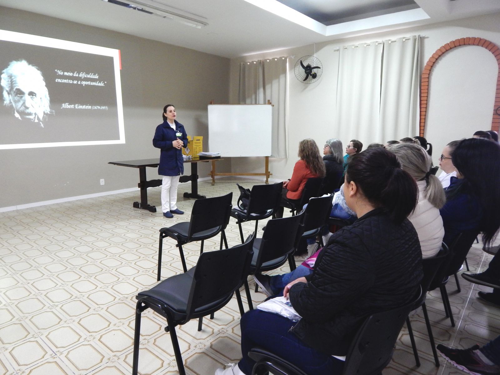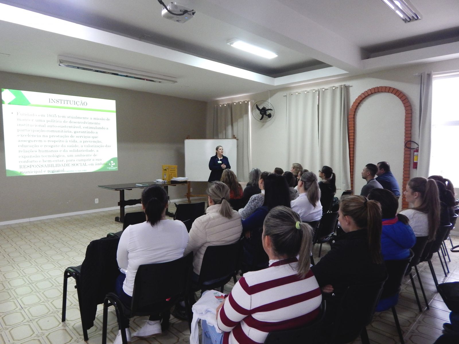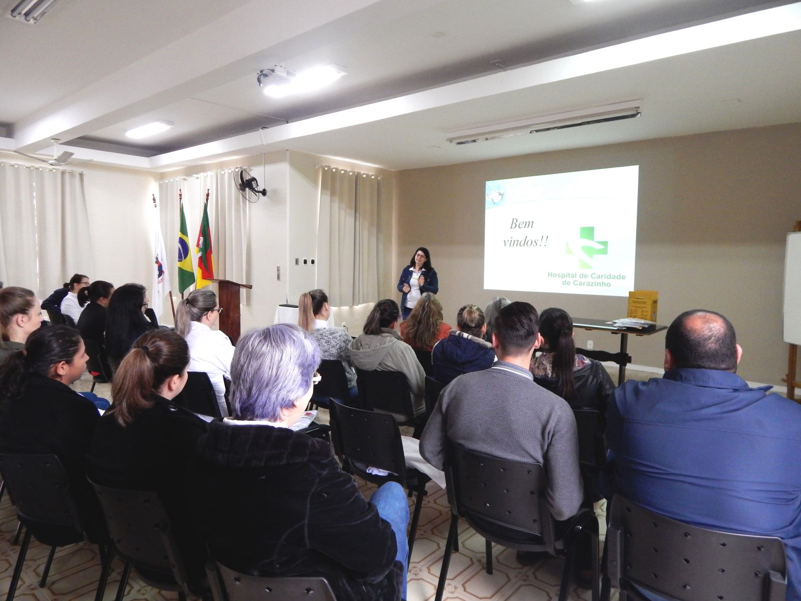 Em seguida, a enfermeira Inara da Cruz transmitiu as orientações relativas ao Serviço de Controle de Infecção Hospitalar, explicando sobre as placas de precaução e sobre a importância da lavagem frequente e correta das mãos. Também, falou sobre a atuação do Núcleo de Segurança do Paciente.