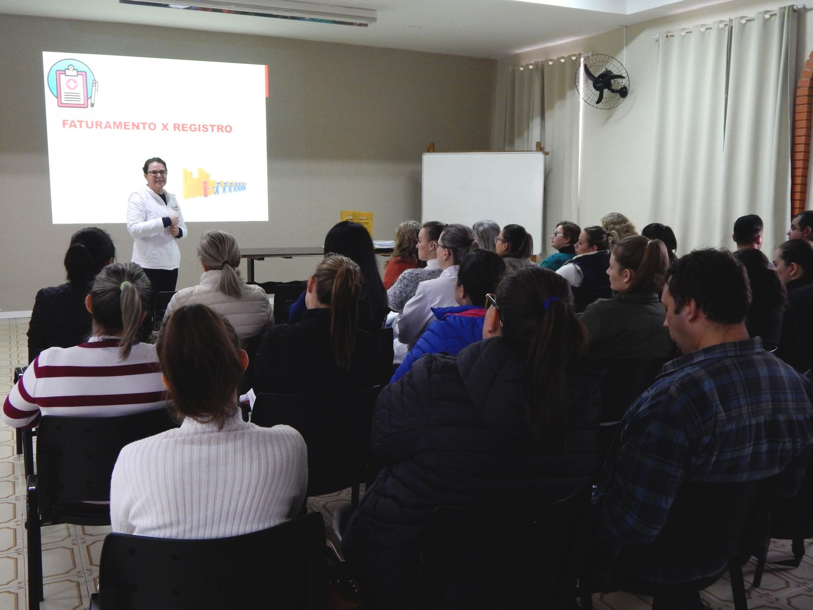Após, ainda, a enfermeira auditora da instituição, Mari Bernhardt, falou sobre os registros de ações e procedimentos que devem ser realizados durante a evolução dos pacientes. E, por fim, a técnica em segurança do trabalho, Elisângela de Oliveira, instruiu os acadêmicos quanto ao uso dos Equipamentos de Proteção Individual – EPIs e às exigências da Norma Regulamentadora nº 32 (NR 32), que estabelece medidas de proteção à segurança e à saúde dos trabalhadores dos serviços de saúde.