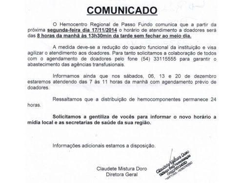 Alteração do horário de atendimento no hemocentro regional de Passo Fundo