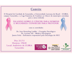 A mesa-redonda “Falando sobre o câncer para homens e mulheres: conhecer para prevenir” acontecerá no dia 21 de novembro, às 19h30, no auditório da ULBRA Carazinho.